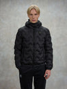 Piumino con cappuccio fisso e profilo dall’aspetto aderente e increspato. Cuciture nastrate ad angoli che dona un tocco innovativo e dinamico.