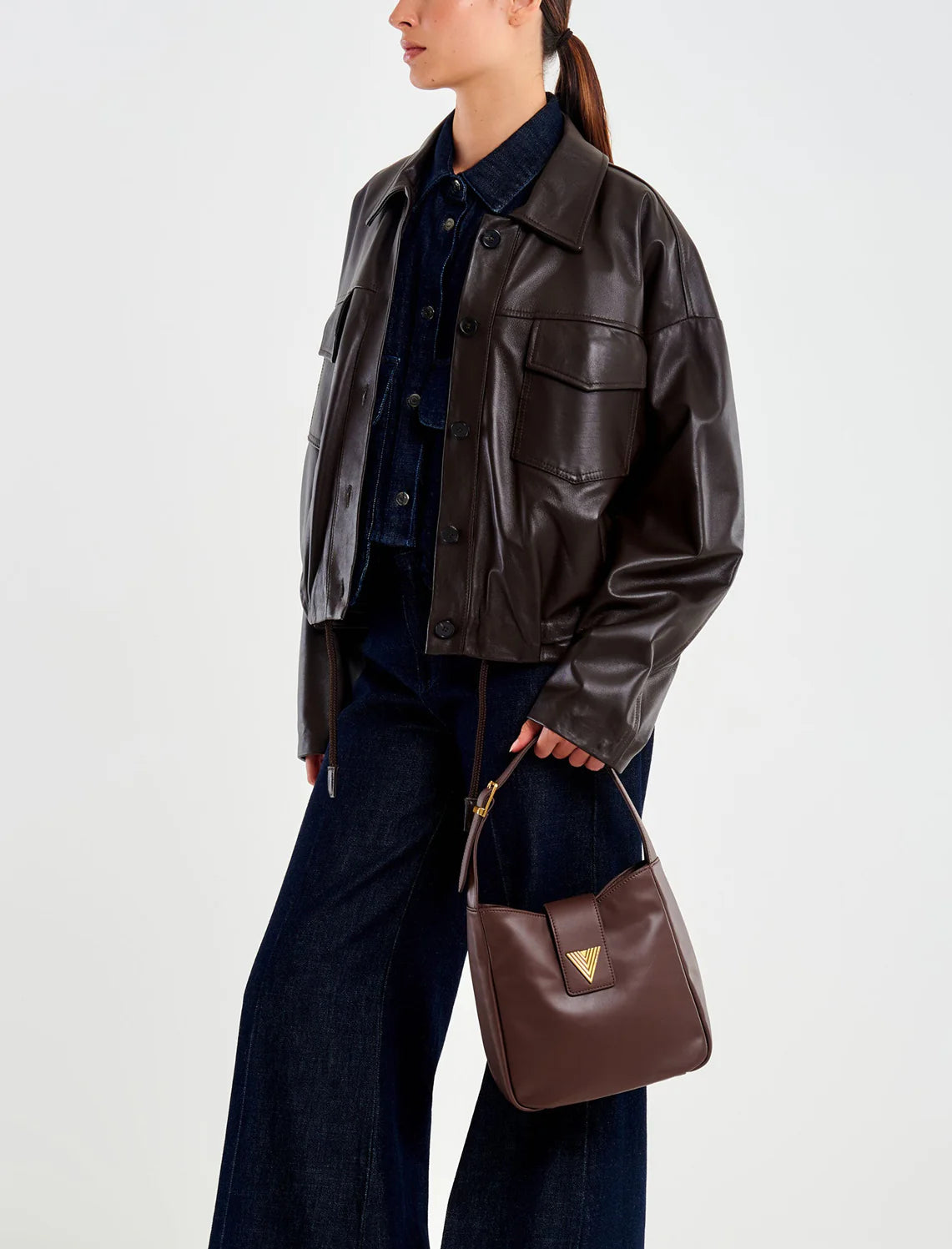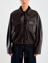 Giubbotto di pelle marrone da donna dal taglio corto e moderno. Presenta colletto classico, chiusura frontale con bottoni e due ampie tasche con patta sul petto, che donano carattere e praticità. Le maniche lunghe hanno una linea leggermente morbida, mentre il fondo con elastico crea un effetto blouson che valorizza la silhouette.