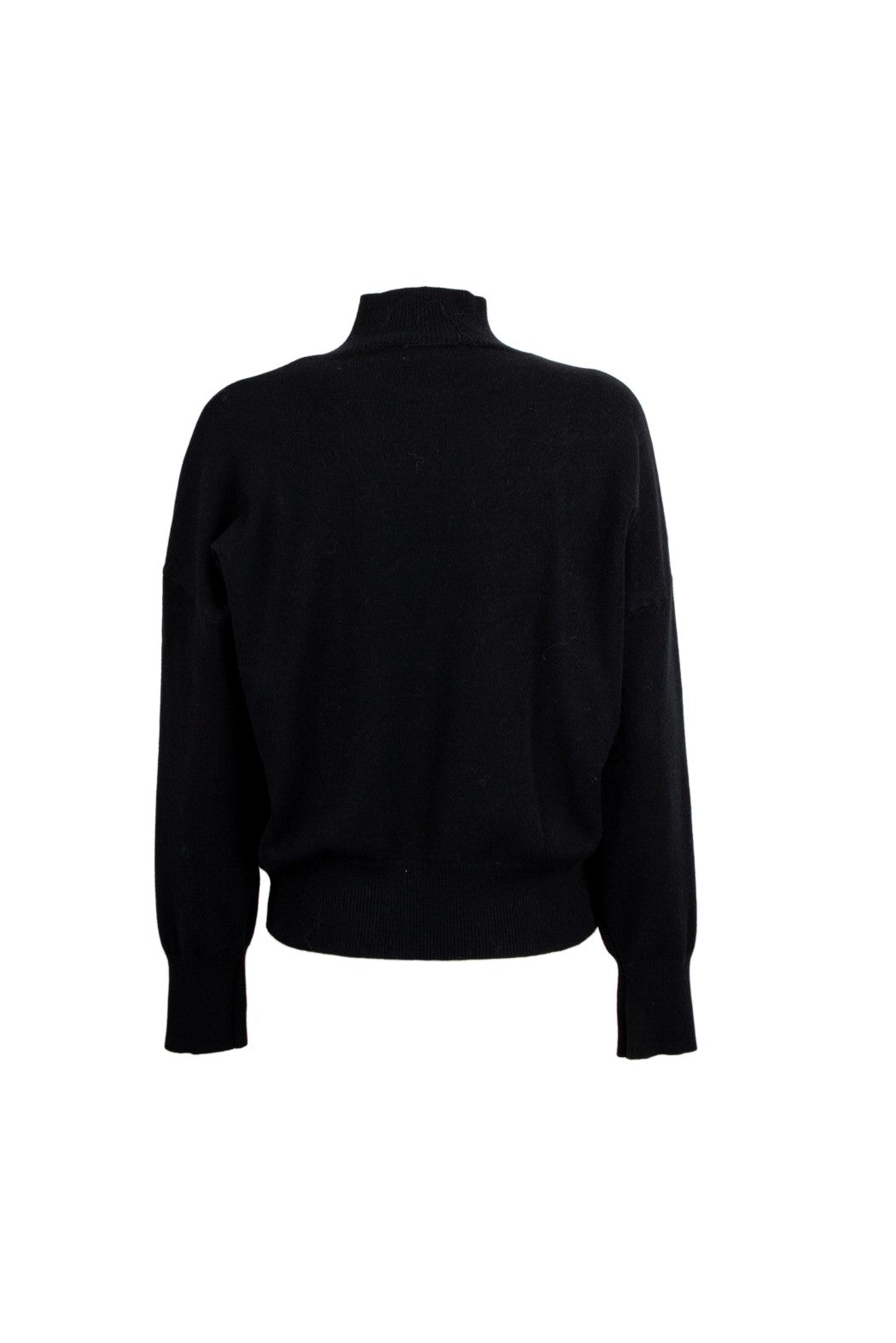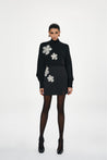 Maglia a collo alto in lana a maniche lunghe, con vestibilità morbida. Decorazione applicata sul davanti con due applicazioni a forma di fiore ricamate in strass argentati. Polsini e orlo a costine.