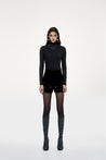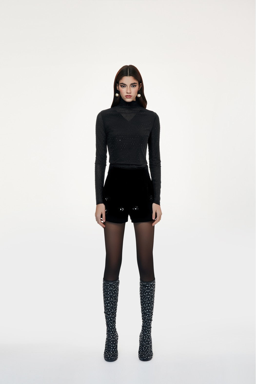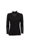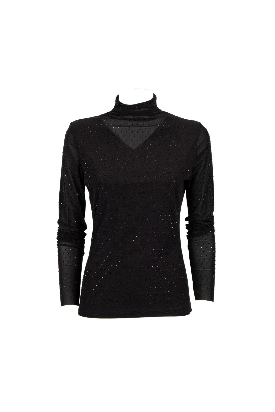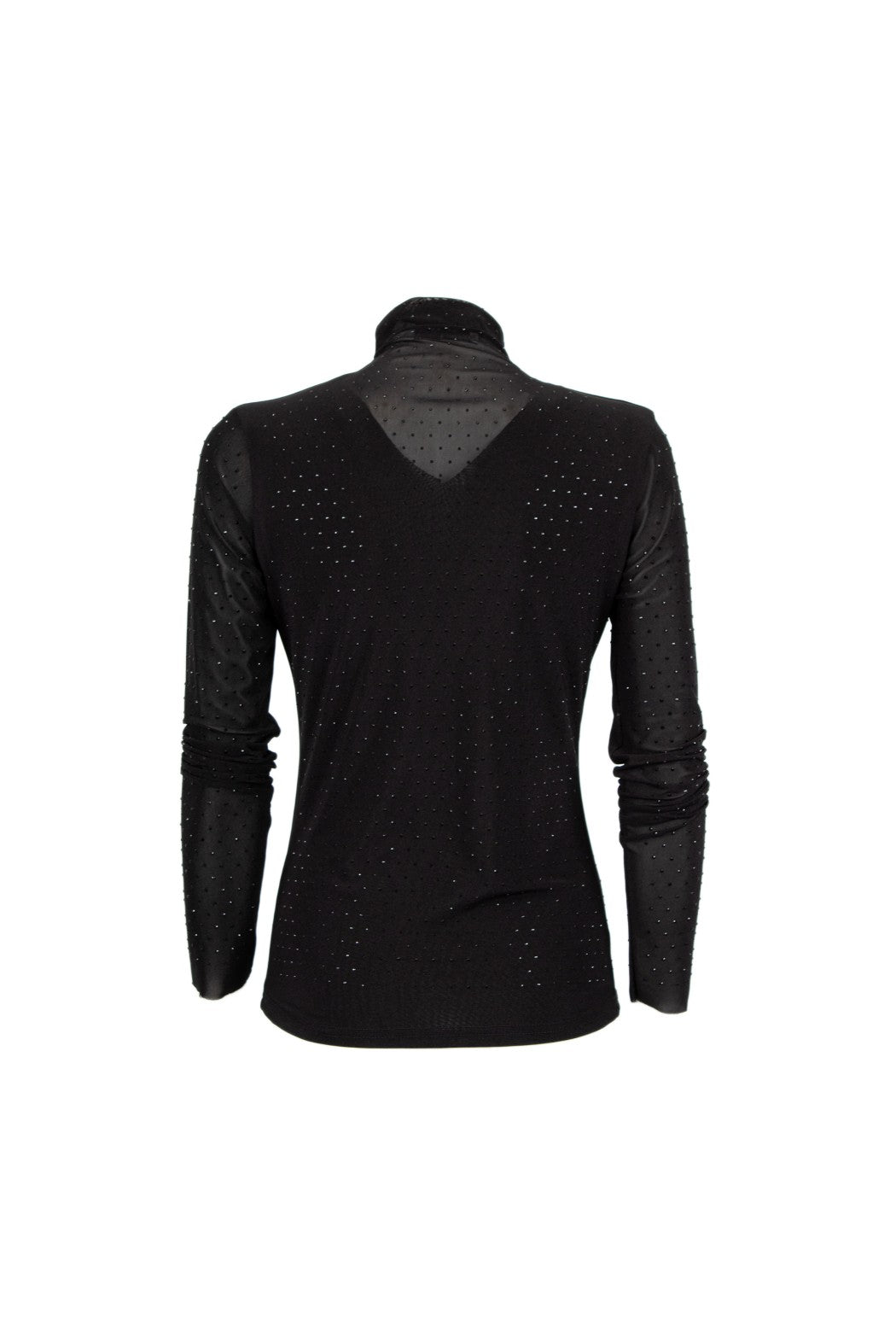 Maglia a collo alto. Vestibilità aderente. Maniche lunghe. Tulle trasparente. Strass applicati su tutta la superficie.